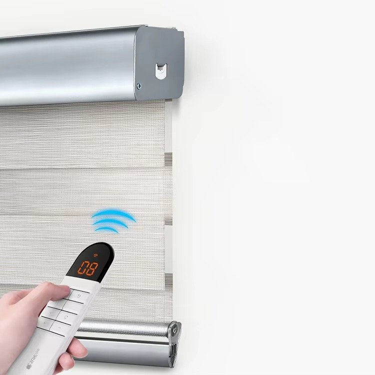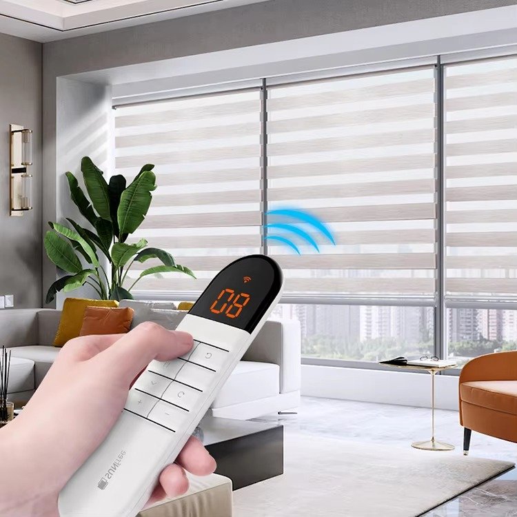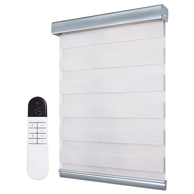 Premium motorized zebra blinds with electric operation and remote control. Features thickened imitation linen fabric for enhanced blackout performance and modern convenience.